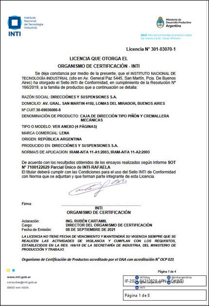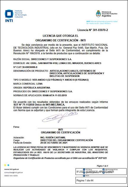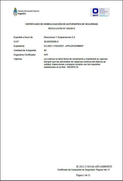 Certificar Nuestros Productos a través de INTI, logrando la homologación CHAS para Autopartes de Seguridad desde Abril de 2016.